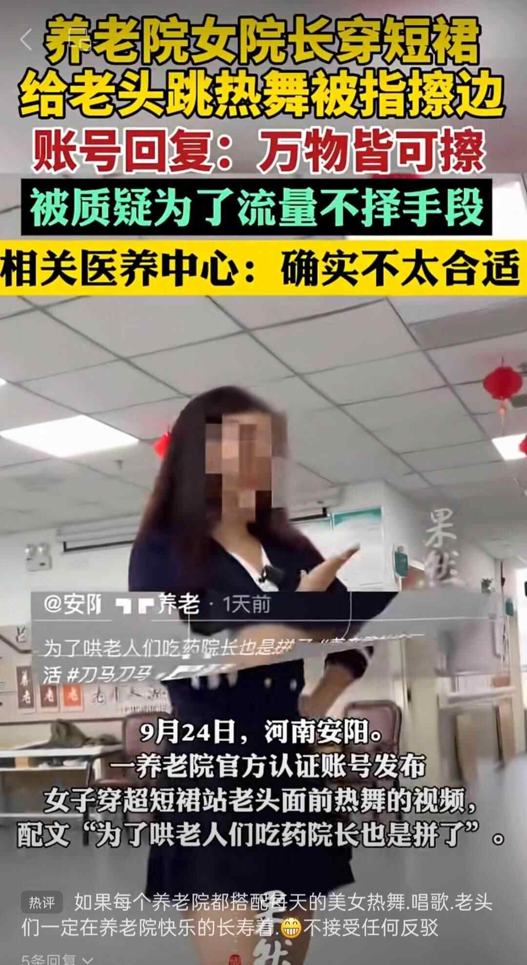 9月24日,河南安阳一家养老院官方社交账号发布的一段“女院长穿超短裙为老人热舞哄吃药”视频,因被指“擦边营销”及账号后续轻佻回应,迅速引发全网热议。截至9月27日,涉事账号已删除百余条相关......